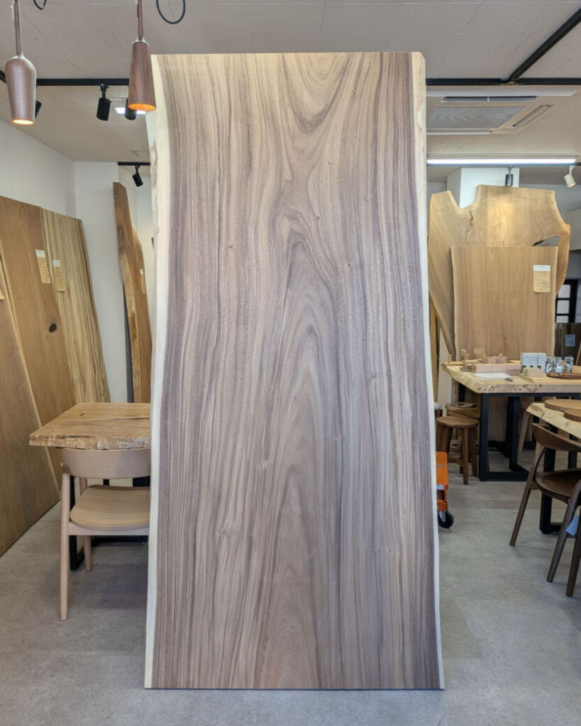 形状は、両サイドに自然の耳(みみ)を残したナチュラルなシルエット、直線的すぎず、かといって個性が強すぎない絶妙なバランスで、ダイニングテーブルとしてもカウンターとしても使いやすい一枚です。空間を選ばず、住宅から店舗まで幅広く合わせやすい点も魅力と言えるでしょう。