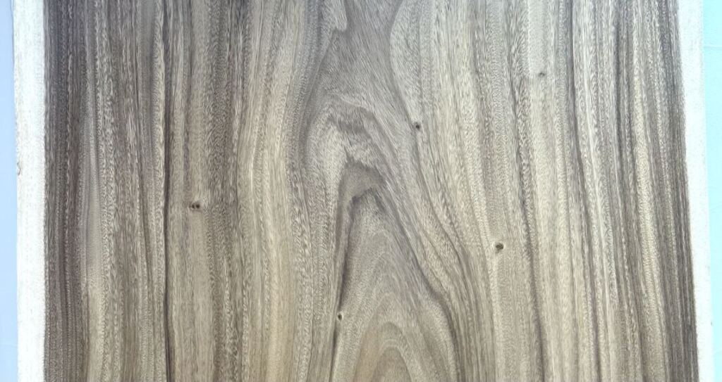 まず目を引くのは、板の中央から左右へ大きく流れるように広がる、穏やかで美しい木目です。力強さの中にもやさしさを感じる曲線的な木目は、モンキーポッドならではの魅力。その中でもこの一枚は、色の濃淡が極端になりすぎず、全体に落ち着いたトーンでまとまっているため、空間に自然に溶け込みながらもしっかりと主役になる表情を持っています。